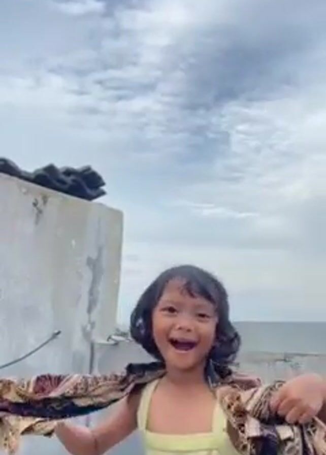 A low-angle shot shows a young girl smiling and looking upwards, her mouth wide open. She is wearing a light yellow top and two pieces of patterned fabric are draped over her shoulders. The sky behind her is overcast with scattered white clouds. In the background, a white concrete structure is visible on the left side of the frame, with what appears to be roofing tiles lying on top. A body of water, possibly the ocean, is faintly visible in the distance. The girl seems to be enjoying herself, holding onto the patterned fabric pieces and looking at the camera.