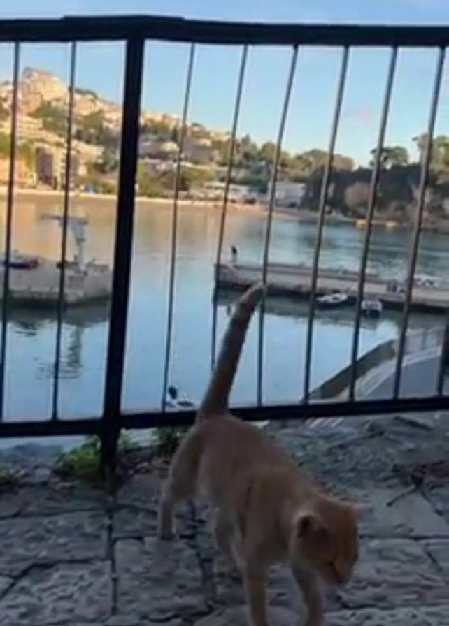 The video begins with a ginger cat walking left to right on a paved surface in front of a black metal fence. The cat exits the frame. Beyond the fence is a view of a bay with several small boats docked along a pier. On the left of the frame, buildings are visible up a hill. The sky is blue with a few clouds.