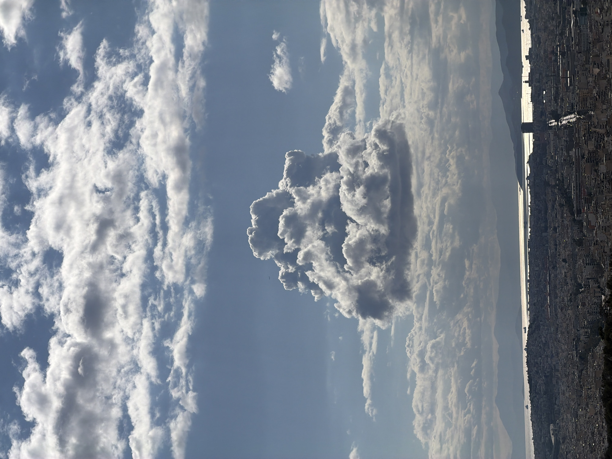 An aerial view shows Athens, Greece, with a cloud formation over the city. To the left are many small clouds, and to the right are land features, followed by a shimmering body of water with a mountain range. A cityscape is to the right with several buildings. The photo is oriented vertically.
