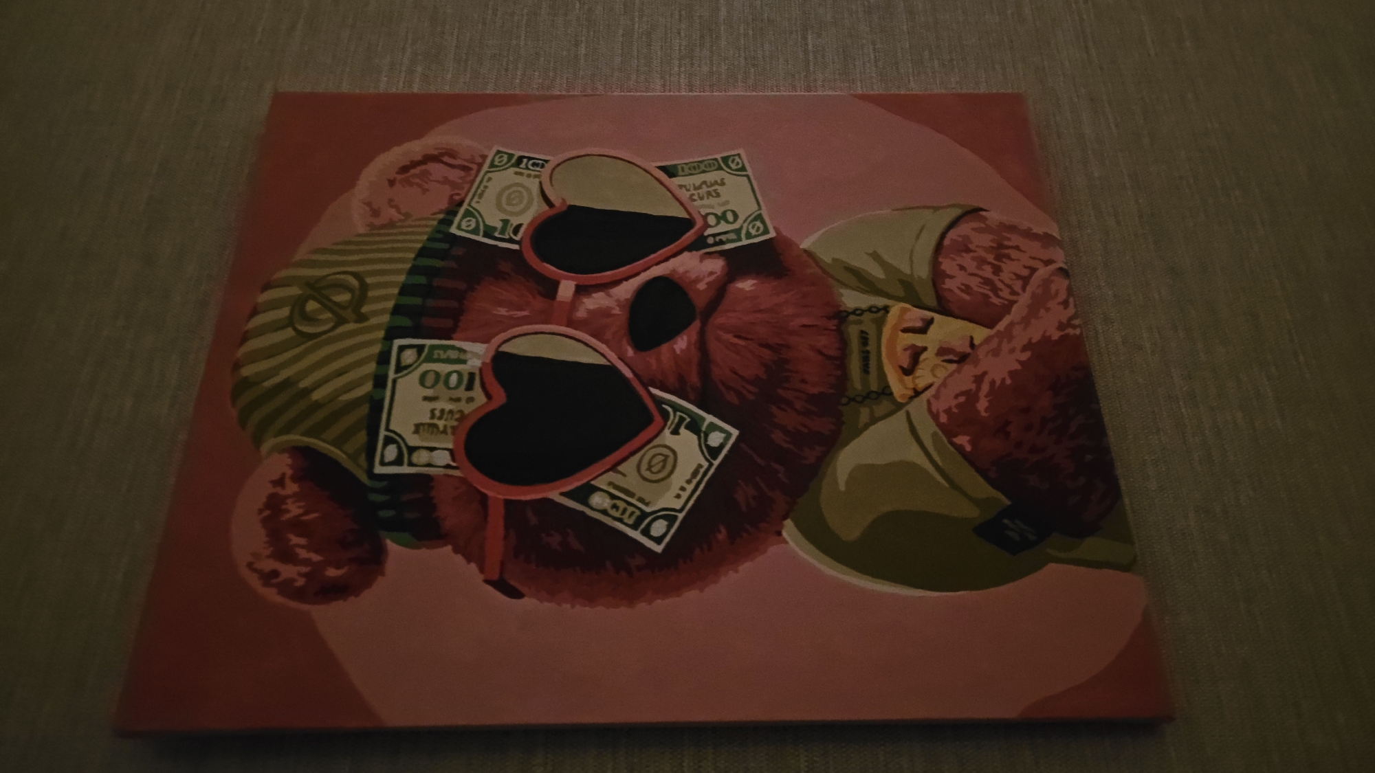 A square canvas painting rests on a textured, grey surface. The painting depicts a red, furry teddy bear adorned with money and heart-shaped sunglasses. The bear's left side features a money bag design. The bear wears a green garment with a pizza slice pendant. The background is a solid pink. The location, Марковский, Russia, is not discernible from the image.