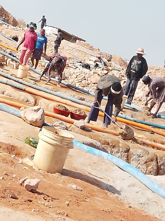 The image portrays an open-pit artisanal mining or excavation site in Jos, Nigeria. Approximately ten individuals are visible across a sloped, rocky, and dusty reddish-brown landscape under clear daylight. In the foreground, a beige plastic bucket is positioned on the bare earth. Several parallel pipes, colored light blue and orange/brown, traverse the scene diagonally upwards from left to right. Between these pipes, two red plastic basins, each containing excavated granular material, are present. A man in a dark green long-sleeved shirt, dark trousers, and a white cap is prominently featured in the center, bent over and actively using a short-handled shovel to dig into the earth. To his immediate right, a woman in a dark patterned dress is bent at the waist, engaged in manual work on the ground. Another individual, also bent low, is visible to the man's left. Further up the slope, a man wearing a straw hat and a dark long-sleeved shirt stands upright, observing the activity. Adjacent to him, a woman in a pink shirt and light-colored trousers carries a light-colored bucket while ascending the slope. Behind her, another woman in a blue shirt and striped skirt walks upwards. An additional individual in a striped shirt and dark trousers is bent over, working on the terrain. Multiple other figures are present in the mid-ground and background, walking or standing amidst piles of rocks and excavated earth. The background consists of extensive mounds of reddish-brown earth and scattered rocks, indicating significant ground disturbance. Crude structures, possibly shelters constructed from corrugated metal, are visible on elevated ground in the upper-mid frame. The sky is pale blue and cloudless, suggesting dry, sunny conditions. The scene depicts manual labor associated with resource extraction in a rugged, arid environment.