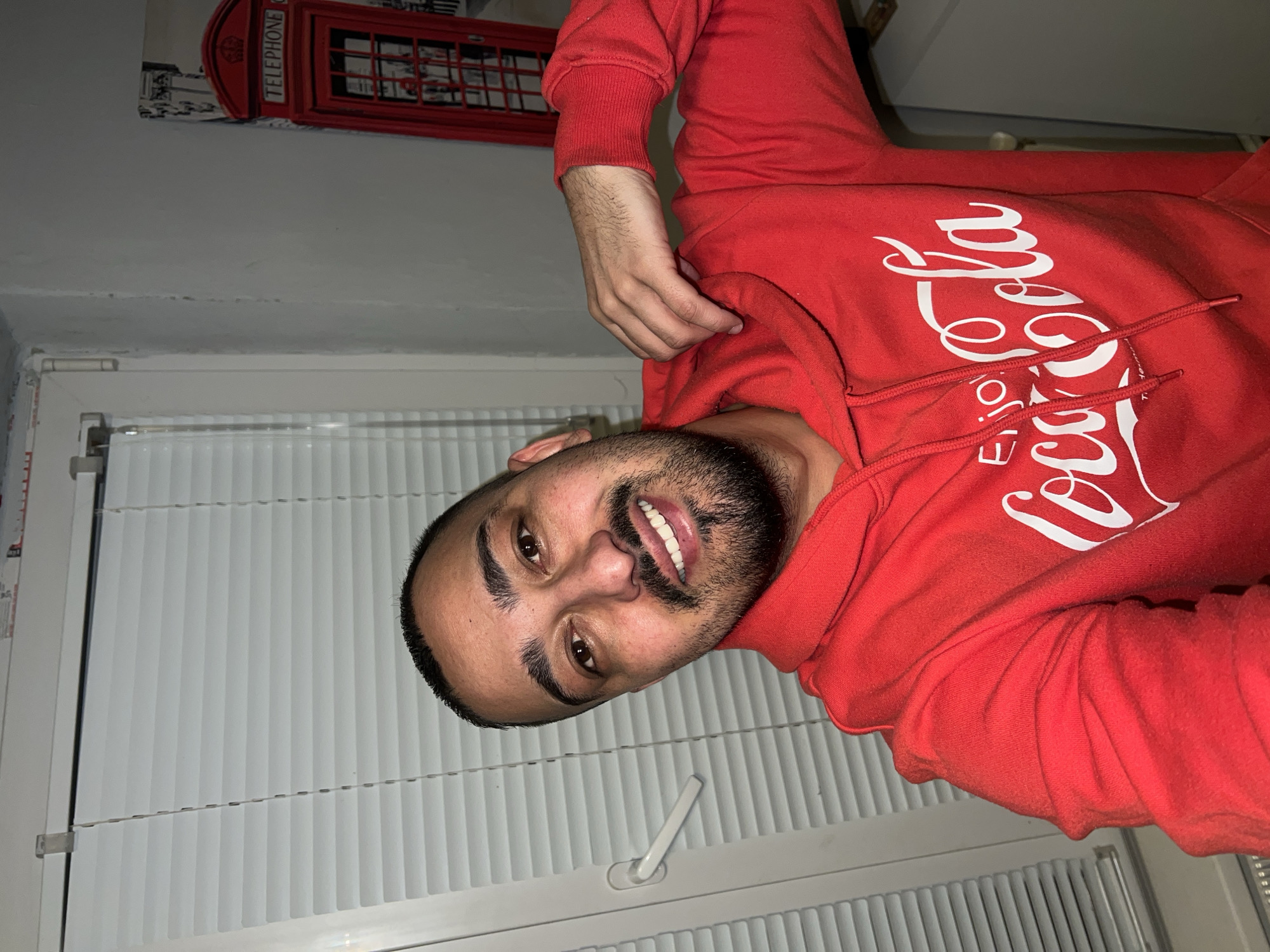 A man with dark hair and a beard is wearing a red Coca-Cola hoodie. He is smiling and looking at the camera. Behind him is a window with white blinds, and above him on the wall is a red telephone booth decoration. It is not possible to ascertain the location as Shumata, Bulgaria from the visual data.