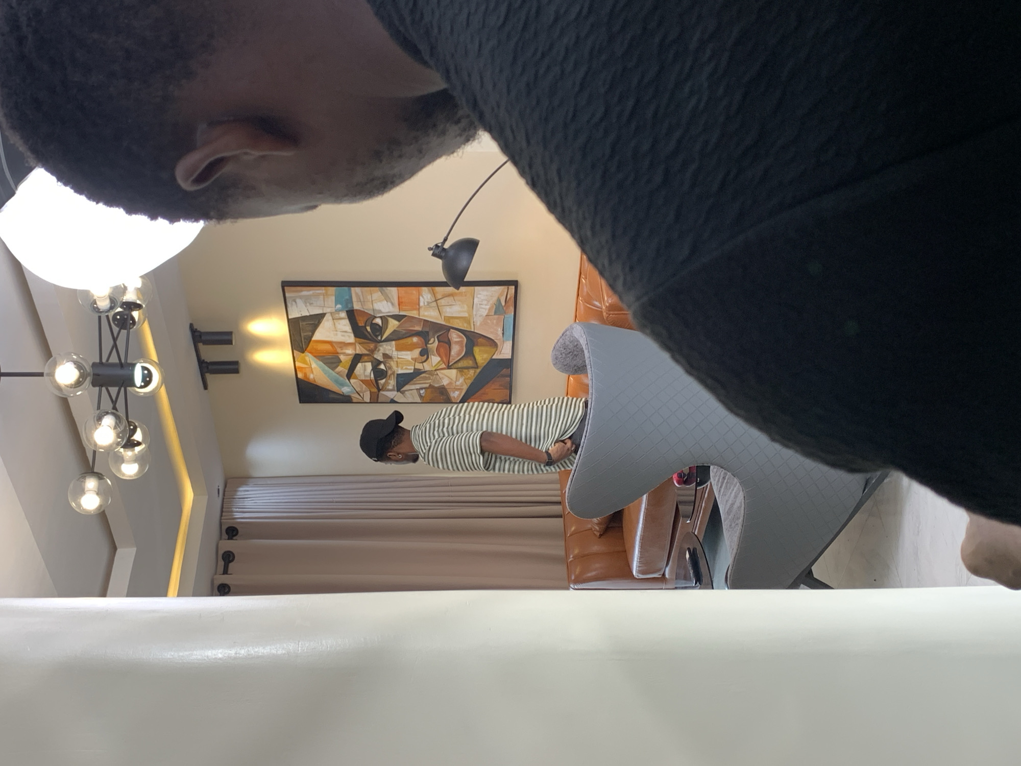 The image depicts an indoor scene, specifically a modern living room or lounge area, located in Moba, Nigeria. In the immediate foreground, the out-of-focus back of an individual's head and right shoulder are visible, featuring short dark hair and dark, textured clothing. This individual appears to be looking towards the right. To the left, a large white pillar or wall segment partially obstructs the view. Beyond the foreground, a second individual stands with their back largely facing the camera, positioned towards the right side of the room. This person wears a black baseball cap, a light-colored striped short-sleeved shirt (with green/white stripes), and dark trousers, with a wristwatch visible on their left wrist. The room features contemporary decor. A brown leather-style sofa is visible behind the standing individual. In front of the sofa, a dark, low-lying coffee table holds what appears to be a remote control and a dark object. A grey armchair with a quilted pattern on its back is situated to the left of the coffee table, facing away from the camera. A prominent feature on the rear wall is a large, framed abstract portrait painting, depicting a stylized face with geometric elements in shades of orange, brown, and blue. Below this artwork, a black arched floor lamp with a dark, upward-facing shade is present. The walls are a light, neutral color, and long, light-colored curtains are drawn across a window area on the left. The ceiling is segmented, featuring recessed lighting that casts a warm glow, and a modern chandelier with multiple spherical glass light fixtures hangs from the center. Two dark, wall-mounted spotlights are visible above the painting. The floor appears to be a light-colored tile or polished surface.