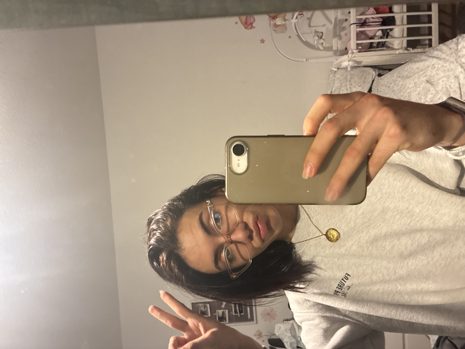 An indoor mirror selfie depicts a female subject with dark, medium-length hair styled back from the forehead