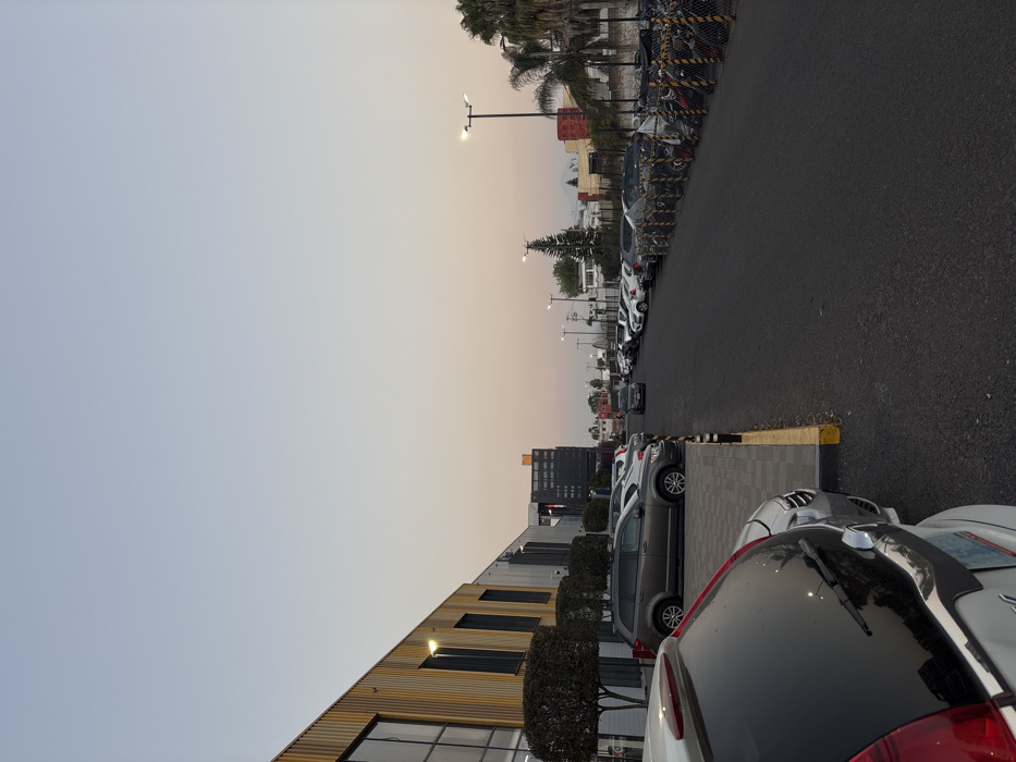 A parking lot is filled with cars parked alongside a modern building featuring a yellow and grey facade. A row of streetlights illuminates the paved road. In the distance, more cars are lined up, with taller buildings beyond. The sky is a mix of grey and orange. Shopping carts are visible behind a fence-like barrier at the far end.