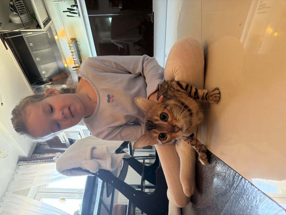 The scene is set indoors within a residential space in the city of Vsevolozhsk, Russia, depicting a young female child interacting with a domestic cat. A female child, appearing approximately five to eight years old, with light-colored hair, is positioned on the floor. She is wearing a light-toned, long-sleeved ribbed shirt adorned with a small red and blue cherry emblem on the chest, and light-colored tights. A delicate necklace with a small pendant is visible around her neck. Her gaze is directed downwards and to the right, and her right hand is observed resting on the back of the cat. The subject cat is a small, short-haired domestic feline, exhibiting a distinctive brown and black spotted and striped coat pattern consistent with a Bengal breed. It possesses prominent, round green-gold eyes. The cat is positioned in front of and between the child's legs, adopting a low, crouched stance with its front paws extended, and is looking directly forward towards the observer. The flooring consists of two distinct materials: a dark wood or laminate surface on the left and a contiguous light-colored, reflective tiled surface on the right. The cat is primarily situated on the tiled section. The background on the left includes a window with white sheer curtains, admitting bright natural light, and a dark wooden high chair or similar piece of furniture. A white towel is draped over an adjacent object. The right background reveals a modern kitchen area, characterized by dark, reflective base cabinets, a stainless steel range hood, and wall-mounted racks displaying kitchen utensils. Warm yellow illumination originates from under-cabinet lighting, and white upper cabinets with a visible dish rack are partially observed above the lower units.