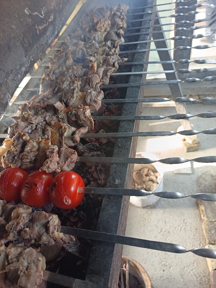 - "Skewers of meat and tomatoes cook over coals in a grill" by FM-a8p7q1, licensed under CC BY 4.0