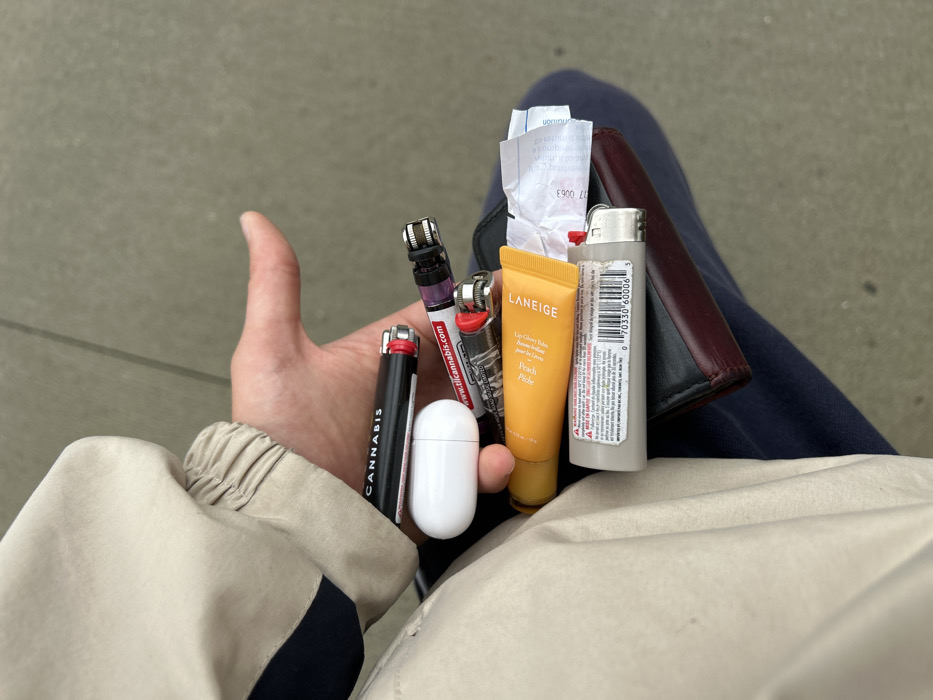 A person is depicted from an elevated perspective, holding a collection of personal items in their open left hand, resting above their lap. The individual wears a light-colored, possibly beige or khaki, jacket sleeve with a dark blue stripe near the cuff. Their lap is covered by dark blue fabric, likely trousers or jeans. The background is a plain, light grey surface, consistent with a concrete sidewalk or floor. The items held in the hand are arranged as follows, from top to bottom: 1. A black lighter with "CANNABIS" printed in white text. 2. A white, oval-shaped electronic earbud charging case, resembling an Apple AirPods case. 3. A purple and black disposable vape pen or specialty lighter, displaying "tilcannabis.com" on a red background. 4. A red lighter, partially obscured. 5. A yellow tube of cosmetic product, labeled "LANEIGE Lip Glowy Balm." 6. A grey standard-size lighter, featuring a barcode (UPC 070330 60006 6) and warning text in French and English, including "MADE IN FRANCE." 7. A crumpled white paper receipt is visible beneath the yellow tube and grey lighter, resting on a dark wallet. 8. A dark bi-fold wallet, with burgundy and black sections, lies beneath all the items, resting on the person's lap. The presence of "CANNABIS" branded lighters and "tilcannabis.com" strongly suggests the scene is located in British Columbia, Canada, where cannabis is legally available. Given the specific request, the location is inferred to be in Vancouver, Canada. The items are casually held, indicating either recent retrieval or preparation for use.