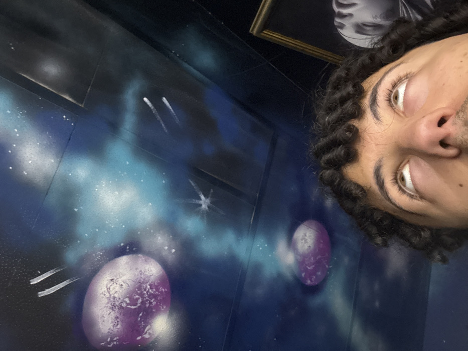 A high-angle, upward-looking photograph captures the upper portion of an individual's face, specifically from the nose upwards, and an interior ceiling with a cosmic art installation