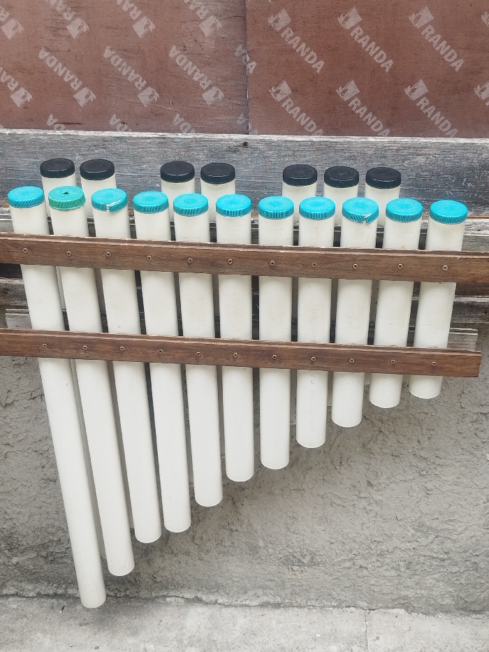 An overhead shot displays a homemade pan flute instrument constructed of white PVC pipes in descending lengths. Each pipe is capped with either a turquoise or black lid. The pipes are held together by two horizontal wooden bars secured with screws. The instrument is set against a textured concrete wall, and a background of brown boards with a repeating "RANDA" logo is visible above the flute.