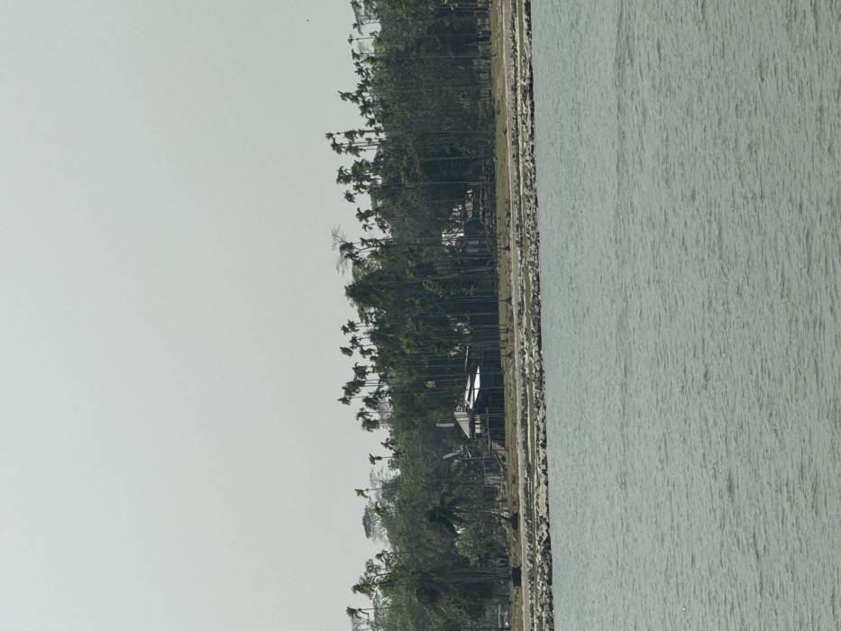 view of a river in Harni, Bangladesh (latitude: 22.867, longitude: 90.615). The river is calm and the water is a light blue-green color. There is a small island in the distance, covered in a dense grove of trees. The island is a mixture of palm trees and other types of foliage. A few buildings are visible on the island, including a single-story structure with a blue roof. The island is surrounded by a rocky shore. The sky is overcast and gray. There are no people visible in the image. The image appears to have been taken from a boat on the river.