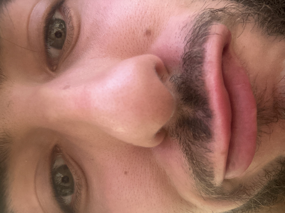 The scene is identified as being located in Carvin, France. The image captures a highly detailed, close-up, frontal view of an adult male's face, filling the entire frame. **Subject:** One adult male. **Appearance:** The individual has light skin with visible pores, particularly across the nose and cheeks. Minor blemishes or moles are present; specifically, a small dark mole is visible on the right cheek (viewer's left) below the eye, and another on the left cheek (viewer's right) also below the eye. A faint, diffuse redness is evident on the cheeks and bridge of the nose. **Facial Features:** * **Eyes:** Both eyes are open, dark, and appear to be brown or hazel. The pupils are visible, and each iris contains a small, bright reflection, indicating a frontal light source. No specific direction of gaze is evident beyond looking directly forward. * **Nose:** The nose is centrally located, prominent, and symmetrical. * **Mouth:** The mouth is closed, with full, pinkish lips appearing slightly pursed or pouting. * **Facial Hair:** A dark, short moustache is present above the upper lip. Dark stubble or short beard growth is visible along the jawline and chin, connecting to the moustache area. **Action/Interaction:** The subject is static, captured in a still portrait. No explicit action or interaction is depicted. **Environment:** No background or environmental details are discernible within the frame due to the extreme close-up of the subject's face.