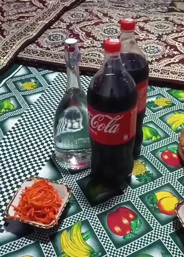 low table setting on the floor, likely for a meal. A patterned rug is visible beneath the table setting. On the table, which has a checkered and fruit-themed tablecloth, there are two large bottles of Coca-Cola, a glass bottle filled with clear liquid (possibly water or a soft drink), and a small square dish filled with shredded orange carrots. The table is positioned in what appears to be a room setting. A dark bag is visible in the background, indicating a room environment. There are no people fully visible in the frame, but a small portion of black clothing is present at the bottom, suggesting the presence of a person behind the camera.
