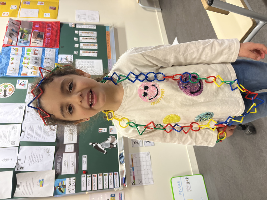 A young girl, around seven years old, smiles at the camera while wearing a multicolored plastic chain as a necklace and headband. Her long-sleeved shirt has smiley face patches. She stands in a classroom, in front of a green board covered with papers, calendar dates, and school-related items. A calendar on the whiteboard states "FEVRIER". A desk and chair are partially visible on the right side of the frame.