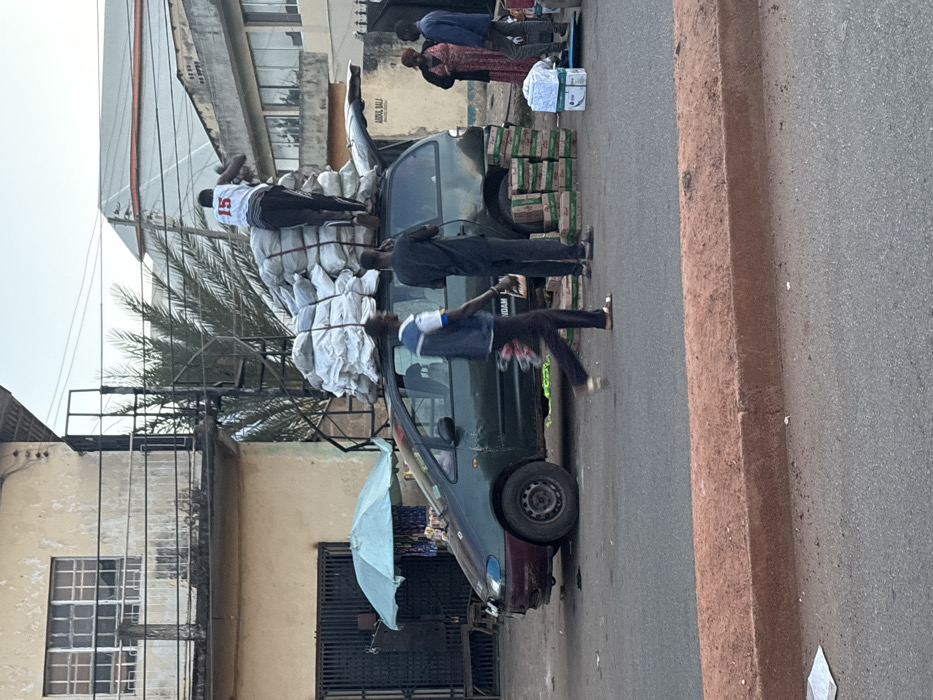 The image portrays a street scene in Jos, Nigeria, featuring a dark green minivan parked on an asphalt road adjacent to a reddish-brown concrete curb. The minivan is heavily laden with multiple large white sacks secured to its roof with red straps; a male wearing a white sleeveless top with the number "15" on the back is standing on these sacks, appearing to adjust or secure the load. The vehicle's rear hatch is open. Below the minivan's rear passenger window, several stacks of green-labeled rectangular boxes are visible on the ground. In the foreground, a male in a blue and white striped top and dark trousers walks from left to right, carrying items in his left hand. Another male, dressed in a dark shirt and trousers, stands stationary beside the minivan. Further to the right, two individuals, one in a patterned dress and another in a blue shirt, stand near a platform with white packages. The background on the left features a two-story building with a pale, weathered facade, an upper balcony with a metal railing, and a ground-floor shop with a corrugated metal security door. A light blue market umbrella is open beside this shop. A black metal spiral staircase ascends the building's side. Palm trees and additional buildings, one displaying a partial sign with "ABDUL SALI," are visible in the distant background. Overhead utility lines are present. The scene is illuminated by natural daylight.