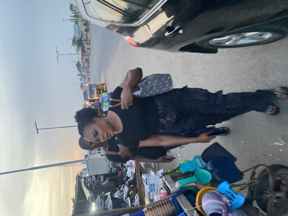 The image presents an outdoor street scene in Lokoja, Nigeria, during twilight hours, indicated by an overcast sky with subtle orange and yellow light on the horizon. In the immediate foreground, a dark-colored SUV or similar vehicle is partially visible on the right, with its rear quarter panel and taillight reflecting light. To the left, a makeshift roadside vendor stall displays merchandise. The lower section of the stall holds various colorful plastic household items, including scoops and brushes. Above, multiple pairs of sneakers and shoes are neatly arranged on wooden shelves. Two females are prominently featured, walking from left to right across the midground. The primary subject, right of center, is a woman with dark skin and braided hair styled into a bun. She wears a black short-sleeved top, dark cargo-style pants, and patterned slides. She carries a patterned shoulder bag on her right shoulder and holds a dark-colored smartphone in her left hand, positioned low near her hip. Her mouth is slightly open, suggesting she is speaking or reacting. Directly behind her, a second female, also with dark skin and dark hair, is partially visible, wearing a dark top and trousers, moving in the same direction. The background reveals a multi-lane paved road stretching into the distance, populated by vehicles, including a yellow Keke Napep (motorized tricycle), cars, and pedestrians. Multiple tall street light poles with T-shaped fixture heads are visible along the road. Low-rise buildings and additional market stalls line the far side of the street, establishing an active urban market environment.