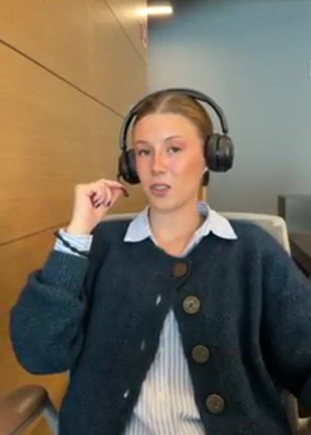 A young woman is sitting in an office chair wearing a headset
