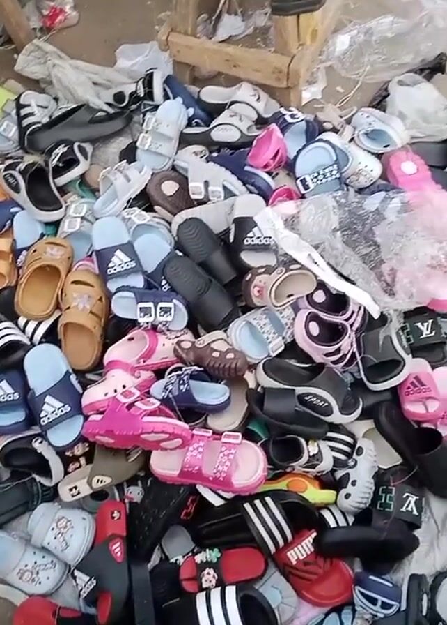 street vendor displaying a large collection of children's sandals and adult flip-flops