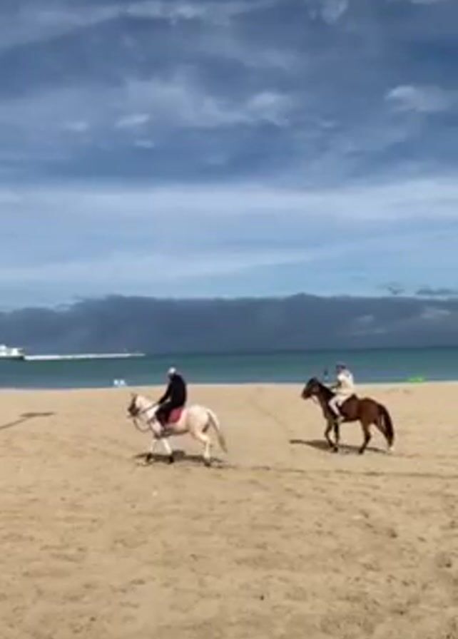 Two people ride horses on a sandy beach under a sky with scattered clouds. One person is on a light-colored horse, possibly white or pale gray, while the other rides a brown horse. The beach is wide, and the ocean is visible in the background. A structure, possibly a pier or breakwater, juts into the sea. The riders are relatively distant, but they appear to be moving at a walking pace.
