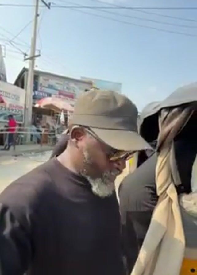 A man with a gray beard, wearing a black shirt, baseball cap, and sunglasses, is seen outside and then inside a yellow auto rickshaw, commonly known as a "Keke". Initially, he seems to be looking at his phone. He then gets into the Keke, where another man is driving. He then places his phone to his ear as if answering a phone call. The video appears to be taken in a crowded, urban street with various shops and other people visible in the background. Electrical wires are overhead.