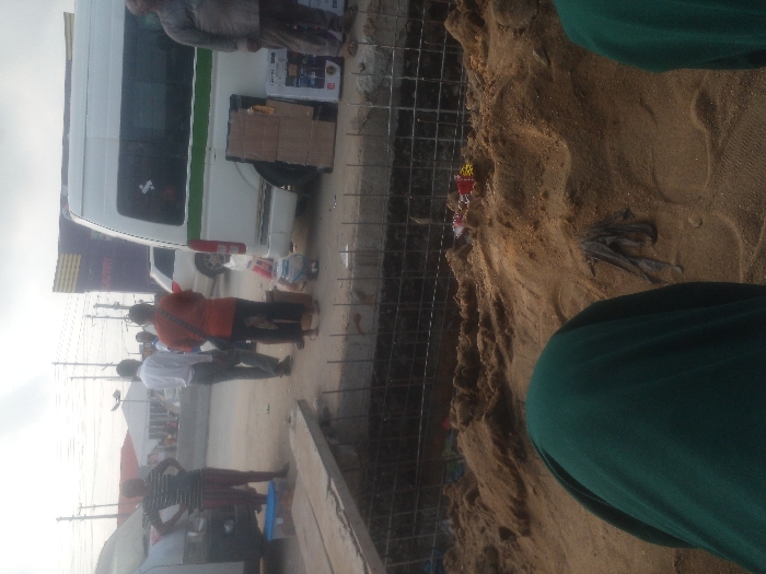 The scene is an outdoor urban environment in Lekki, Nigeria, depicted from a low perspective. The immediate foreground features a large mound of light brown sand, with the lower portions of two individuals dressed in dark green attire visible on either side. Scattered dark, elongated debris rests on the sand. A horizontal trench containing a metal grid structure separates the foreground from the mid-ground. A wooden plank serves as a makeshift bridge over the trench on the left side. On the paved surface beyond the trench, several individuals and vehicles are present. From left to right: A person wearing a striped shirt and dark trousers stands with hands on hips, positioned near a blue container. Adjacent, a male in a white collared shirt and dark trousers stands facing towards the right. A person in an orange-red shirt with a dark shoulder bag is visible from the back, near a small dark cylindrical object. To their right, a male in light-colored traditional attire stands next to a white passenger van that has a prominent green horizontal stripe along its side. Multiple cardboard boxes, one featuring an image of an electronic screen, are stacked on the pavement next to this van. A portion of a second white van is visible on the far left, and a light-colored SUV is partially discernible behind the central group of people. The background shows a street receding into the distance, lined with utility poles and power lines against a bright, overcast sky. Buildings are visible, including a prominent commercial sign with blue, yellow, and red elements above the rightmost white van. A white tent-like structure is also visible further down the street on the left.