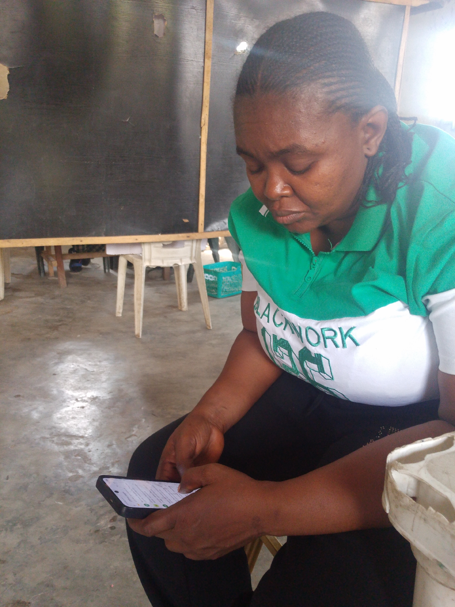 An adult female sits and looks down at a smartphone she is holding with both hands. She wears a green and white shirt with black pants. The shirt has the word "BLACKWORK" written on it. Her hair is braided and swept back from her face. The background includes a dark, framed board attached to a wall. There are white plastic tables and chairs visible. The floor appears to be a concrete surface. The location appears to be indoors.