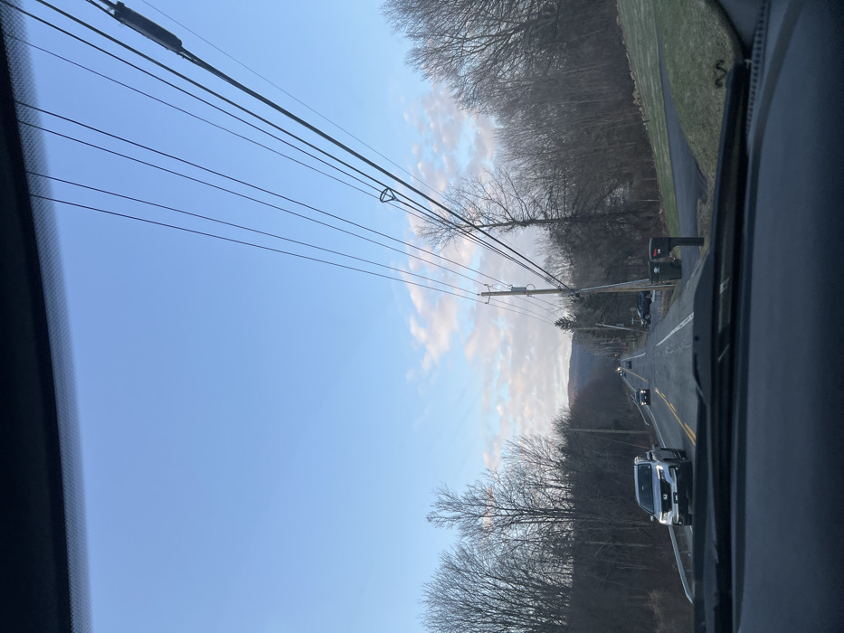 The image captures a view from inside a vehicle looking forward on a two-lane asphalt road in the Village of Monroe, United States of America. The observer's dashboard and a portion of the windshield are visible in the lower foreground. The road extends into the distance, marked with a double yellow line separating the lanes and a white solid line on the right shoulder. Several vehicles are present on the road. In the immediate left lane, a silver pickup truck, identifiable as a Honda Ridgeline, is traveling towards the observer. Further down the road, additional vehicles are visible in both directions. To the left of the road, a dense line of bare deciduous trees indicates a winter or early spring season. To the right of the road, a wooden utility pole stands, supporting multiple black overhead wires that run diagonally across the upper right portion of the sky. Below the utility pole, two dark-colored mailboxes are situated beside a paved driveway leading up to a grassy, upward-sloping area. More bare trees line the roadside and the sloping terrain. In the background, rolling hills or mountains, also covered with bare trees, are discernible under a horizon dominated by a clear blue sky with scattered white clouds. No pedestrians are visible.