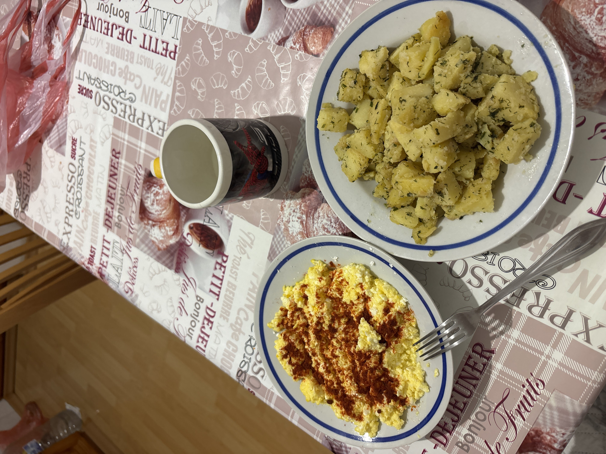 table setting with two plates of food, a mug, and a fork, set on a tablecloth with French breakfast-themed prints. One plate contains cubed potatoes with herbs, while the other holds scrambled eggs sprinkled with paprika. A fork rests near the egg plate. A mug with a design is also present. The tablecloth features repeating phrases and images related to a French breakfast, such as "Petit Dejeuner," "Croissant," and drawings of pastries. A red plastic bag and a small cup are visible in the upper left corner. The location, Burgas, Bulgaria, is not evident in the image.