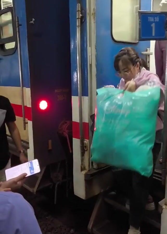 Several people disembark from a train. The train has blue and white exterior paint with red accents. Passengers are exiting from “toa so 1”, car number 1. Most are carrying large bags. A woman in a blue shirt and hat is holding a mobile phone.