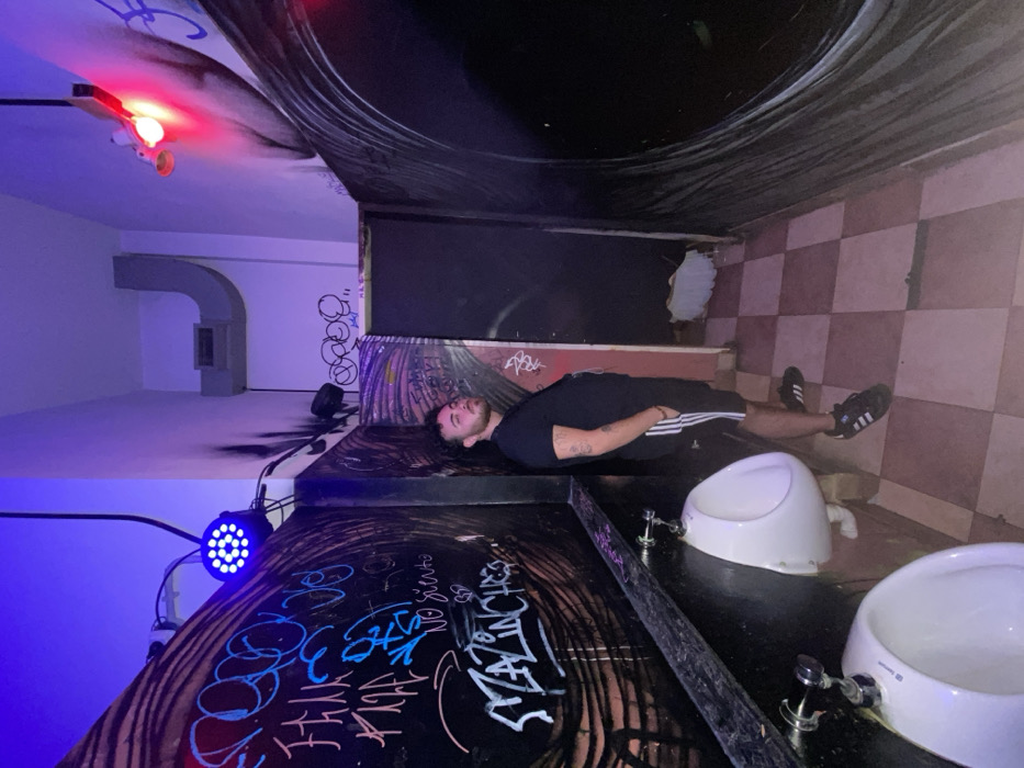 A man is lying horizontally across the top of urinals. He is wearing a black t-shirt, shorts with three white stripes, and black sneakers. Graffiti covers the walls and urinal dividers. A checkerboard tile pattern is visible on the wall behind the urinals. The ceiling above the urinal area is dark. In the foreground, a blue light illuminates the room. A red light fixture is seen on the adjacent ceiling, with a blank white wall behind it.