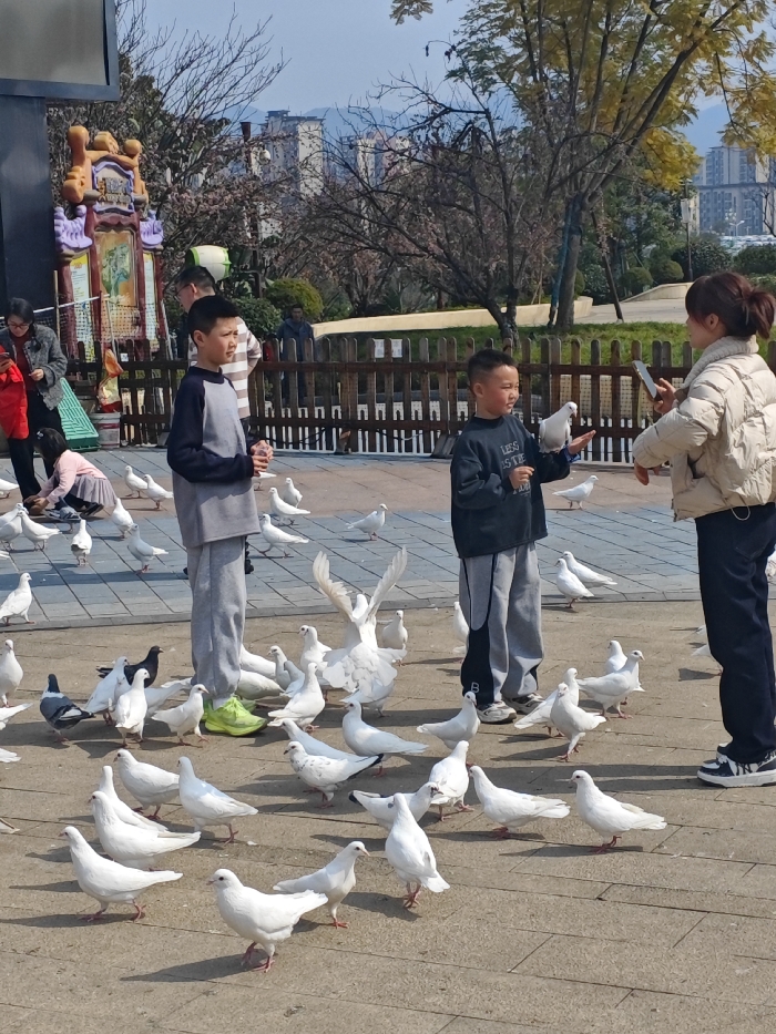 Two young boys are standing surrounded by many pigeons, primarily white. One boy holds a pigeon on his outstretched hand, while a woman takes a photo of him. They are standing on a paved area in what appears to be a park, with a fence and trees in the background. Other people can be seen in the distance.