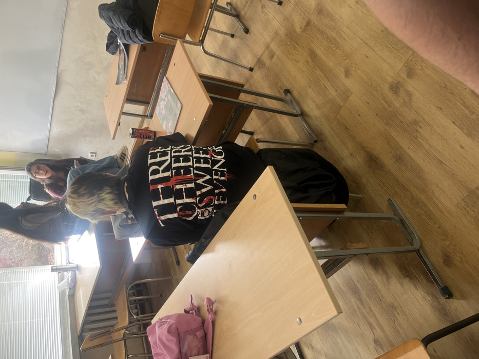 The image depicts a classroom in Pravets, Bulgaria, featuring four individuals and standard classroom furniture. In the immediate foreground, a light-colored wooden desk with a pink backpack on its left side occupies the left of the frame. The lower right corner reveals a portion of a human leg, indicating a first-person perspective from an adjacent desk. The central figure, viewed from behind, is a person with short, light-colored hair, possibly featuring yellow-green streaks. They wear a black t-shirt with partially blood-splattered white text on the back, reading "THREE CHEERS SWEET REVENGE." This individual is seated on a brown stool-like chair at a light wooden desk with grey metal legs. A black garment is draped over the chair or their lap. On their desk, a red "Bello" branded energy drink can is visible, alongside a dark-colored object and a square-shaped item with a light design. In the background on the left, a large window with horizontal blinds overlooks autumn foliage. Against the wall below the window, a light-colored wooden desk holds a silver thermal flask, a white tissue box, and another small container. Two students are positioned around this desk: one with long dark hair sits on the desk's edge, wearing a grey top and blue jeans; the other, with medium dark hair and glasses, is seated on a chair, facing partially towards the center, wearing a maroon top and blue Adidas-branded jeans, appearing to speak while holding a mobile phone. The background on the right features a white wall with a textured grey lower section. A light-colored wooden desk with a dark jacket draped over it is visible, along with a brown wooden chair to its right. The floor throughout the classroom is covered with light brown laminate flooring. The room is illuminated by natural light entering through the window.