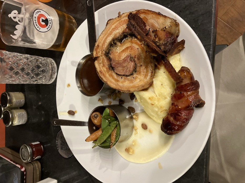 The scene depicts a prepared meal presented on a white ceramic plate, situated on a dark, reflective table surface within an establishment in Windermere, United Kingdom. The central component of the meal is a large, spiral-cut portion of roasted rolled meat, exhibiting a crispy golden-brown exterior and internal stuffing. Resting against this are several strips of dark, crispy meat, possibly crackling or bacon. A bacon-wrapped sausage is positioned at the lower left of the plate. Accompanying the meats are a serving of light yellow mashed potatoes and a lighter, off-white purée. A small metal ramekin holds dark brown gravy, while a miniature metal pot contains roasted whole carrots and green sugar snap peas. Dried fruit, identifiable as raisins, and chopped nuts are scattered across the plate surface. To the right of the plate, a textured clear drinking glass stands next to a Camden Town Brewery branded pint glass, which contains an amber liquid approximately one-third full. In the background, three small jars of condiments are visible, one containing a red substance and two with lighter-colored contents. A partial view of a beige personal bag is present on the far left. A black QR code sticker, marked 'TABLE 10', is affixed to the table surface.