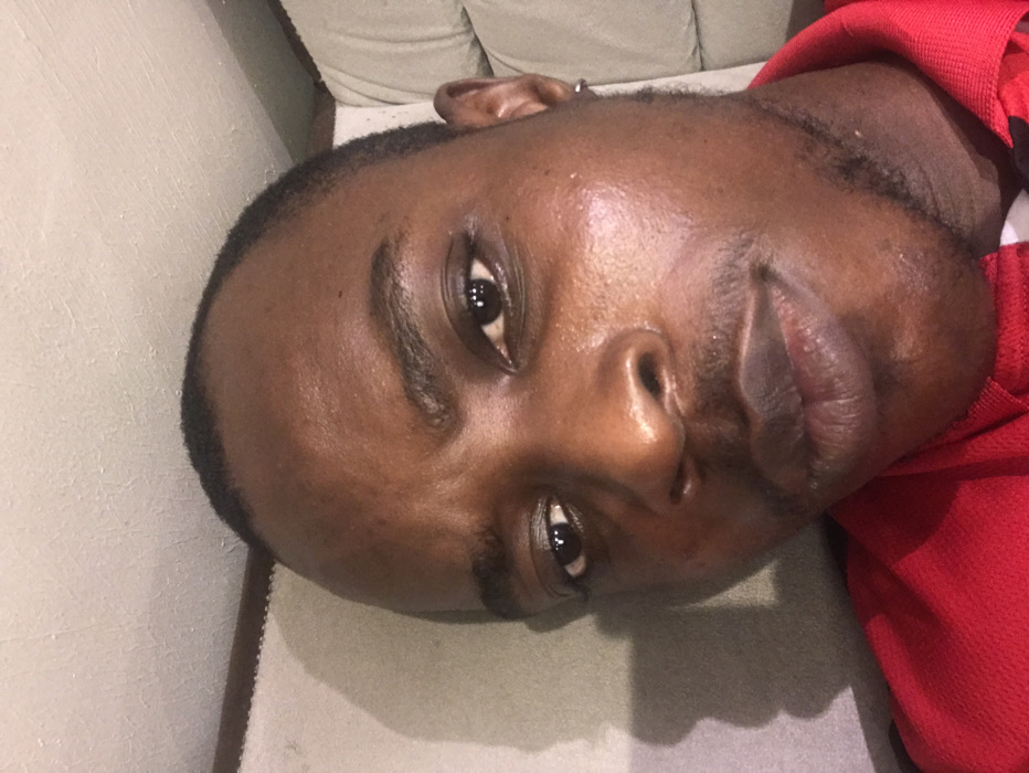 A close-up, head-and-shoulders portrait of an adult male with dark skin is presented, taken indoors in Lekki, Nigeria