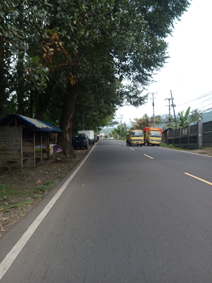 This image depicts a roadside scene in Khajuripada, India, under an overcast sky. An asphalt road, marked with a solid white line on the left shoulder and a broken yellow line down its center, recedes into the distance. On the immediate left, a dirt verge is present, leading to a row of large trees with dense green foliage. Beneath these trees, a rudimentary open-sided stall or shelter with a blue tarp roof and woven bamboo-like walls is situated. Further along the left side, a dark-colored sedan is parked partially under the trees, followed by a white truck or van. One or more indistinct human figures are partially visible near these parked vehicles in the mid-ground. On the right side of the road, two yellow trucks are parked parallel to the road; the truck further from the viewer has a red tarp covering its cargo bed. Behind these vehicles, a dark grey or black concrete wall runs parallel to the road. Overhead power poles with multiple utility lines are positioned along this side. Beyond the wall and poles, green vegetation, including broad leaves resembling banana plants, is visible. Distant hills or mountains rise in the background beneath the bright, cloud-covered sky. No explicit actions or interactions among individuals are clearly discernible.