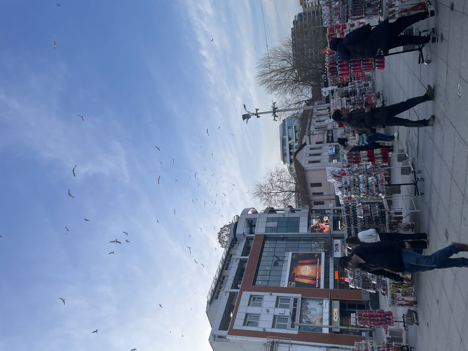 The scene is a busy urban pedestrian area in Burgas, Bulgaria, specifically along Alexandrovska Street near the Tria City Center building. The ground is paved with light-colored rectangular stones. On the left, a multi-story modern building features a glass facade on its lower levels. Visible signage includes "COWORKING SPACE," "IQOS," and "BOSS." A large digital display screen on the building shows advertisements. A distinctive dome-shaped structure is visible on the building's rooftop. In the midground, numerous portable market stalls with wheels are arranged, displaying a wide assortment of small consumer goods and accessories, predominantly in pink, red, blue, and black packaging. These items are hung on racks or placed on shelves. Several individuals are present. In the foreground, a man wearing a dark jacket and blue jeans walks towards the left. In the center-right, a man in a dark jacket and pants browses merchandise at one of the stalls. A woman in a white sweater stands near the center stalls. Another person in a black puffer jacket examines items on the far right. No direct interactions between individuals are clearly depicted; people are primarily engaged in walking or browsing. Behind the market stalls, older, two-story buildings with light facades are visible, and in the distant background, modern residential or commercial structures rise. Bare-branched trees suggest a cooler season. A multi-armed street light pole stands on the right side of the frame. The sky is clear blue with scattered white clouds. A large flock of seagulls, numbering over fifty, is actively flying and soaring across the upper two-thirds of the image.