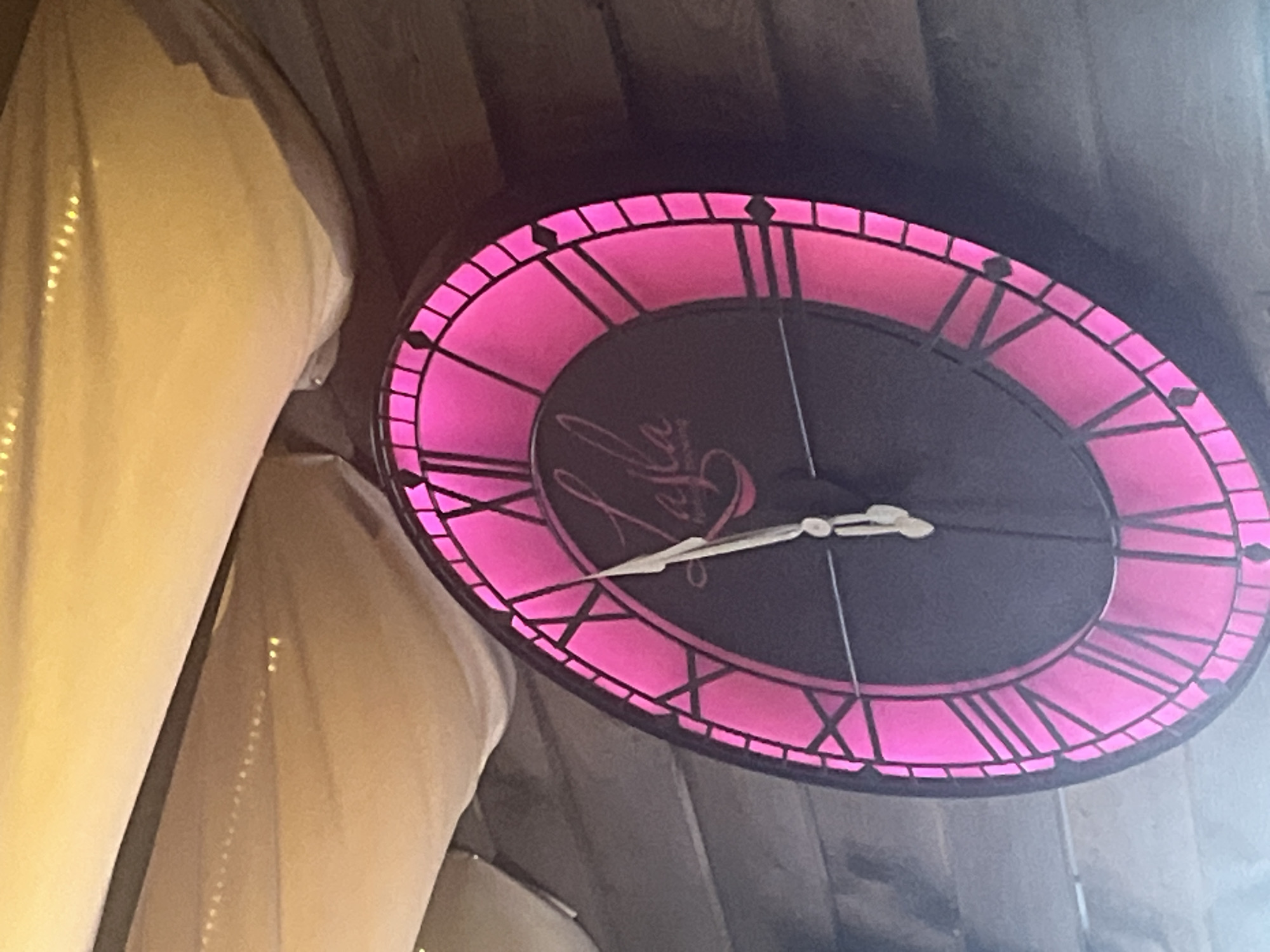 A close-up, tilted, indoor shot depicts a clock with Roman numerals on a pink, illuminated ring