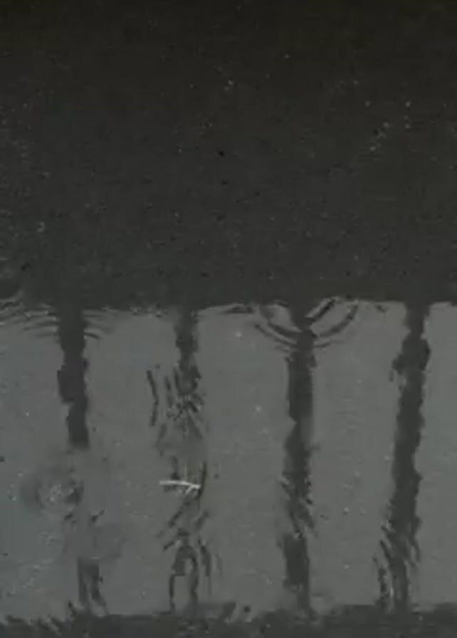 close-up of a dark, asphalt surface with a puddle of water. Raindrops fall into the puddle, creating ripples. A reflection of vertical bars is visible in the water. A small, pale object, possibly a leaf or twig, floats in the puddle. The lighting is dim and overcast.