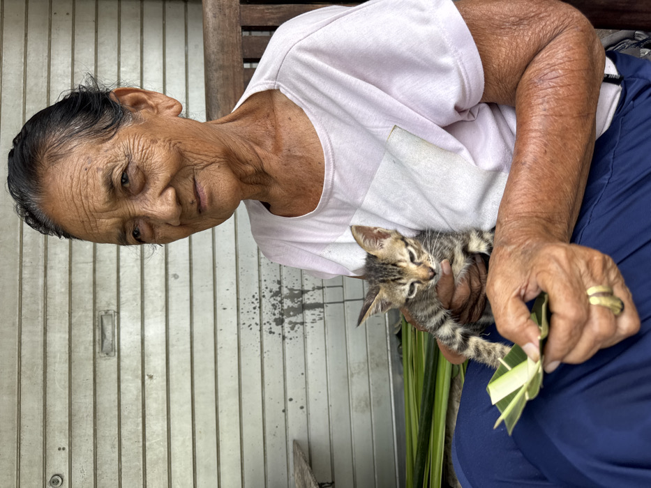 An elderly woman, appearing to be of Southeast Asian descent, is seated in an outdoor or semi-outdoor setting in Kuta, Indonesia. She is looking to the right with a faint smile. Her dark grey hair is pulled back, and her skin exhibits visible wrinkles. She wears a light pink t-shirt and dark blue pants, with two gold-colored rings on her right ring finger. She cradles a small, brown and black tabby kitten in her left arm, which appears drowsy and is looking downwards. Her right hand holds a small, intricately woven item constructed from green palm leaves. In the background, a light-colored, horizontally corrugated metal rolling door or shutter is visible, displaying dark splatter marks on its lower left section. To the left of the woman, a stack of fresh, long green palm leaves rests on an obscured surface. A dark wooden bench is partially visible behind the woman.