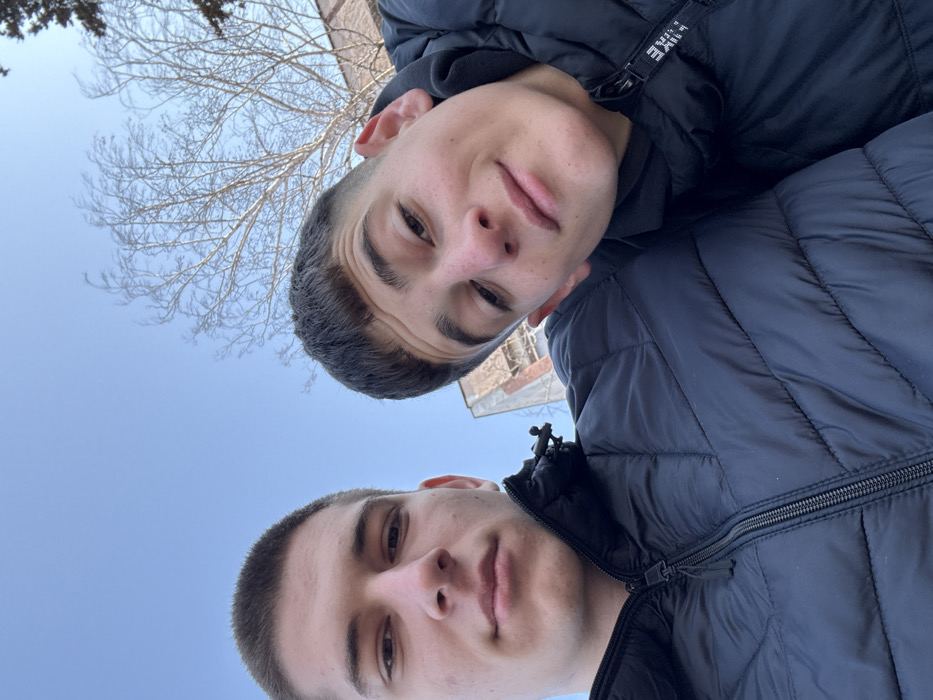 The image displays two males captured in a low-angle, close-up photograph against a clear blue sky in Cherven Bryag, Bulgaria. The individual on the left has short, light-brown hair and a neutral facial expression, wearing a black zip-up puffer jacket. The individual on the right has short, dark-brown hair with a fringe and a slight smile, also dressed in a black puffer jacket with a white tag or logo visible on the upper right side. In the background, bare tree branches extend against the blue sky on the upper right. A partial view of a reddish-brown brick building, showing signs of wear and exposed structural elements on its upper section, is visible behind the right individual.
