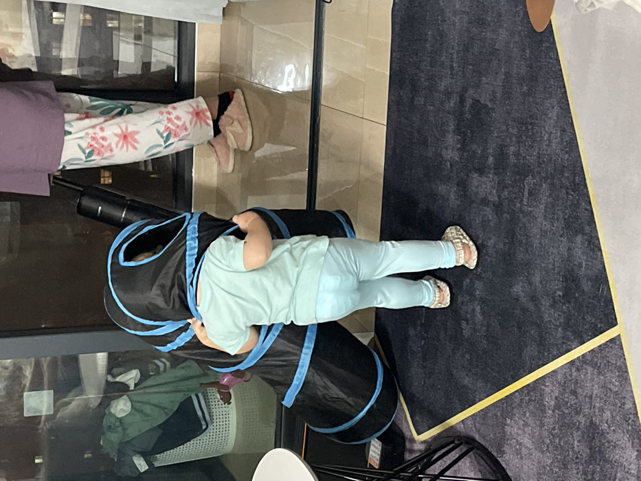 A child in blue leggings and a pale green shirt is positioned on a patterned rug, emerging from a black play tunnel trimmed with blue. The tunnel is near a glass door or window. Nearby, there is a person wearing floral pajama pants and pink slippers. A laundry basket is visible behind the tunnel.