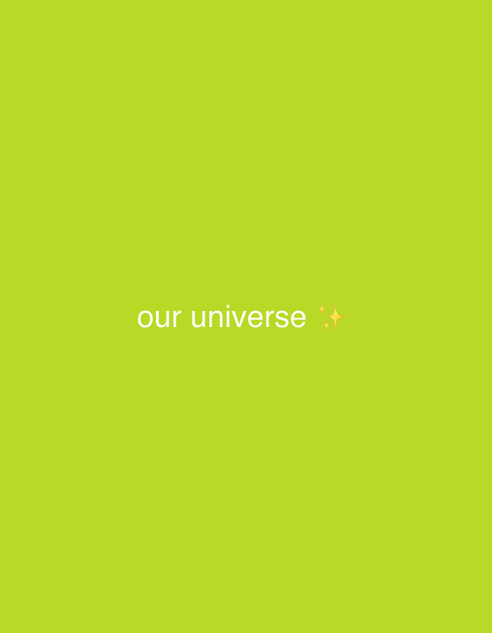 This digital image, situated in Oploo, Netherlands, displays a uniform lime-green background. Centered horizontally and slightly above the vertical midpoint, white sans-serif text reads "our universe." To the immediate right of this text, two identical orange-yellow four-pointed star emojis are present. No discernible people, physical objects, actions, or interactions are depicted within the visual frame.