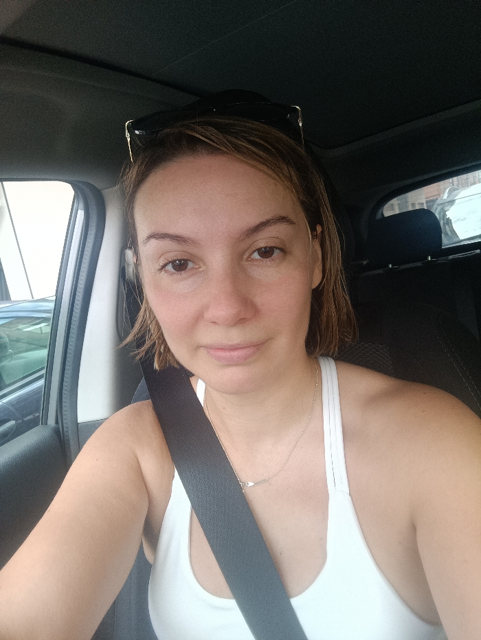 A female individual is depicted in a medium-shot, seated inside a vehicle in the city of Sagunto, Spain