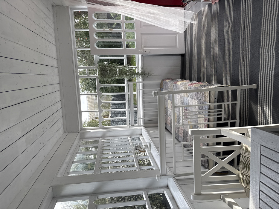 This image depicts an enclosed porch or sunroom, located in Chernihiv, Ukraine. The room features a white wooden planked ceiling, white wooden paneled walls, and extensive white-framed windows composed of multiple glass panes, with some upper sections exhibiting decorative arched mullions. A dark gray and white striped rug covers the floor. A white metal-framed daybed or bed with a mattress and a multi-colored patchwork quilt is positioned along the left wall, beneath a window. In the lower-left foreground, a white wooden chair with an 'X' backrest and a light-colored cushion featuring a leaf pattern is partially visible, next to a section of a light wooden slatted table. On the right side, a white wooden door with glass panels is open, from which a sheer white curtain with polka dots billows inward. A hanging plant with light green foliage is suspended from the ceiling. A clear glass jar rests on the windowsill. Natural daylight illuminates the scene, casting distinct shadows. Beyond the windows, green trees and a distant gray building with a ridged roof are visible.