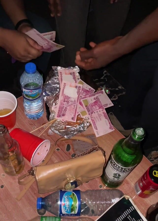 The scene depicts a wooden table covered with items suggestive of a social gathering or party. Several individuals surround the table, but only their hands and lower bodies are visible. One person is holding a stack of paper money, while another touches the bills scattered on the table. The money appears to be pink and possibly local currency. Additional objects include empty or partially full plastic bottles of water and soda, an empty beer bottle, a full bottle of green liquor, a red solo cup with liquid, and a small tan purse. A crumpled foil containing food is also visible on the table, adding to the cluttered appearance. A black menu or notebook lies on the table. The surroundings appear dim, suggesting an indoor or nighttime setting.