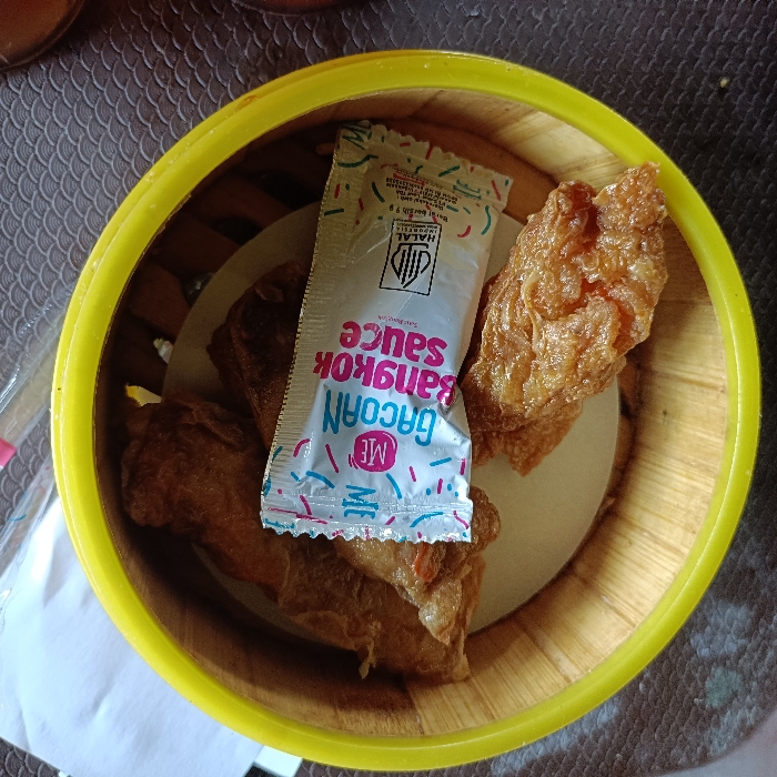 A yellow bamboo steamer basket containing three pieces of fried, breaded food. The food is arranged in a circular pattern, with one piece in the center and two pieces on either side. In the center of the basket, there is a small, colorful, rectangular package of "Garcorn" and "Bansakor Sauce" with the words "ME HALAL" on the package. The food is in the steamer basket which is on top of a brown surface. The scene is in Kecamatan Brangsong, Indonesia, which is located at the coordinates -6.953 latitude, 110.22 longitude.