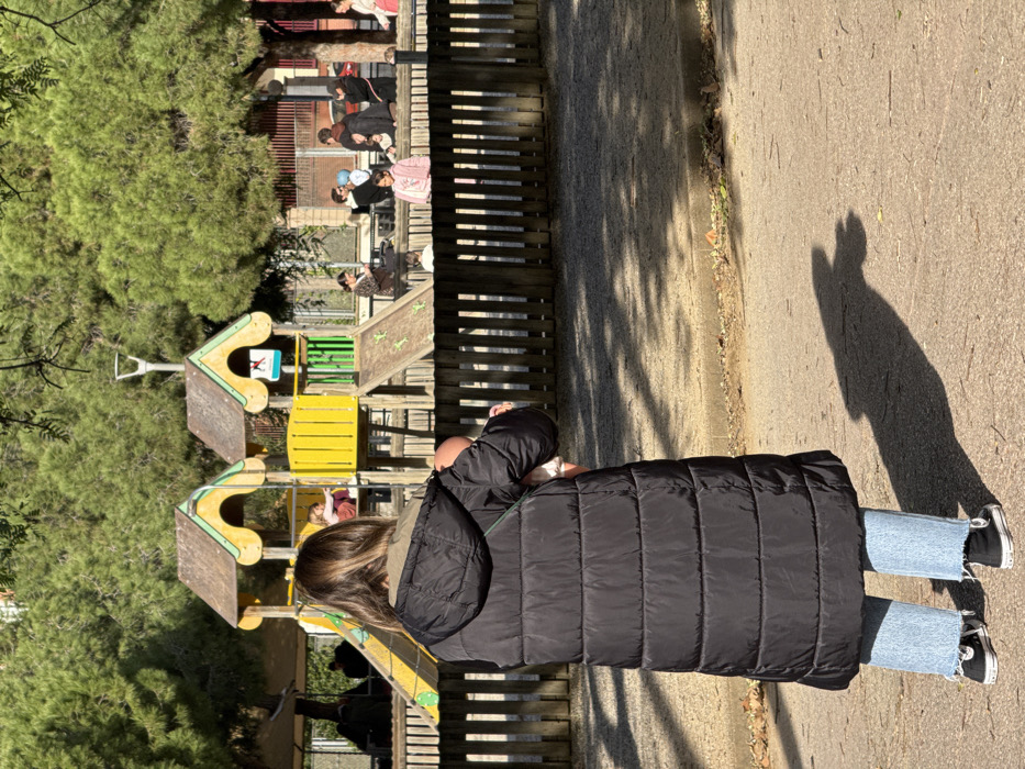 The image depicts a daytime scene in a park within L'Hospitalet De Llobregat, Spain. In the foreground, a person is viewed from behind, wearing a long black hooded puffer coat, light blue ripped jeans, and black low-top sneakers. This individual is holding a light-skinned baby doll, cradled in their left arm. The midground features a children's playground enclosed by a low wooden picket fence. Inside the fence, a multi-level wooden play structure is visible, featuring yellow and green platforms, two brown-roofed towers, slides, and a climbing ramp with green handholds. A blue and white rectangular sign, possibly indicating a restriction, is affixed to one tower. Multiple individuals, including adults and children, are present within and around the playground area. One child in a light pink top is visible on a platform of the play structure. Other adults are standing or sitting, some appearing to interact with children. The background consists of numerous evergreen trees with dense green foliage. Beyond the trees and playground, elements of urban architecture are partially visible, including building facades and a metal fence. The ground surface in the foreground is a paved area, exhibiting distinct, elongated shadows from the trees and the primary subject, indicating bright sunlight from an angle.