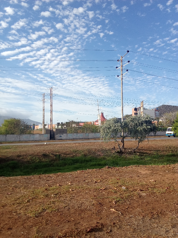 The image captures an outdoor daytime scene in Pampatar, Venezuela, under a bright blue sky patterned with scattered altocumulus clouds. The foreground consists of dry, reddish-brown earth interspersed with patches of green grass and minimal scattered debris. A paved road stretches horizontally across the midground, bordered on the left by a low, light grey concrete barrier exhibiting visible graffiti. Behind this barrier, two tall, aged metal utility poles stand, with a complex of commercial buildings, notably a prominent red and white structure, visible further in the background. Distant green hills are present on the far left horizon, partially obscured by haze. On the right side of the road, a single light-colored utility pole with multiple crossarms supports numerous overhead power lines. To the right of this pole stands a multi-trunked tree with light green-grey foliage. In the far background on the right, additional buildings are visible, backed by a steep, vegetation-covered hill. A white utility van is partially visible on the extreme right edge of the paved road. No individuals or specific actions are depicted.