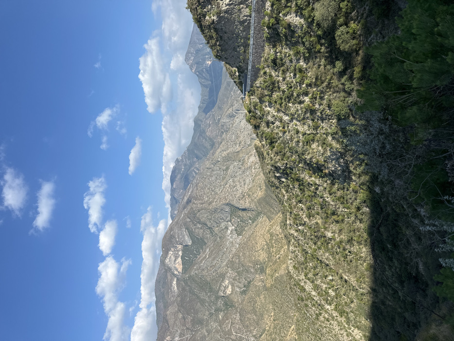 A striking landscape unfolds with a clear blue sky dotted with fluffy white clouds. Rugged, sunlit mountains rise dramatically, their slopes revealing intricate textures. Vegetation clings to the mountainside on the right, transitioning from sparse greenery to darker, denser trees. A narrow, man-made structure spans a divide between the mountains, a faint horizontal line in the vast expanse. The image is oriented sideways.