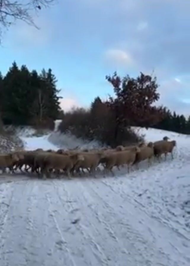 - "A flock of sheep is walking on a snow-covered road" by FM-4GKkh1, licensed under CC BY 4.0